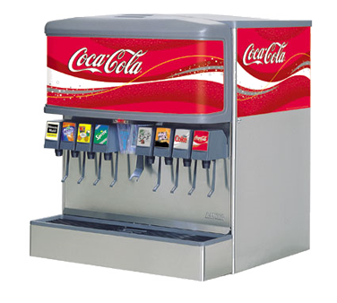 4500 Series Ice Beverage Dispenser, 30″W x 30-1/2″D, 250 lb. cubelet/nugget ice capacity, (10) LEV¨ self serve lever valves, manual front load when ice maker installed, manifold: 3-1-2-1-3, illuminated Coca-Cola graphics & Coca-Cola side and back decals, high capacity over-fill drip tray, low ice indicator, key lock switch, 3/8″ barbed fittings, stainless steel construction, 115v/60/1-ph