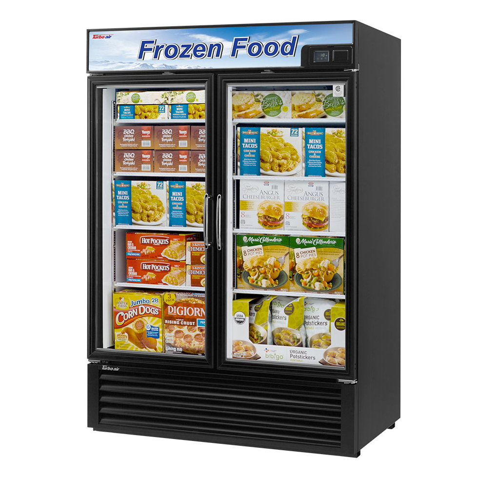 Freezer Merchandiser, two-section, 39.8 cu. ft., self-contained, (2) triple pane heated glass doors, LED lighting, (8) adjustable PE coated wire shelves, digital temperature controller, door opening alarm, self-diagnostic monitoring system, automatic fan motor delays, Turbo freezing, smart fuzzy defrosting, LED sign panel, solenoid valve, black exterior, bottom mount compressor, R290 Hydrocarbon refrigerant, 1 HP, 115v/60/1-ph, 9.8 amps, NEMA 5-20P